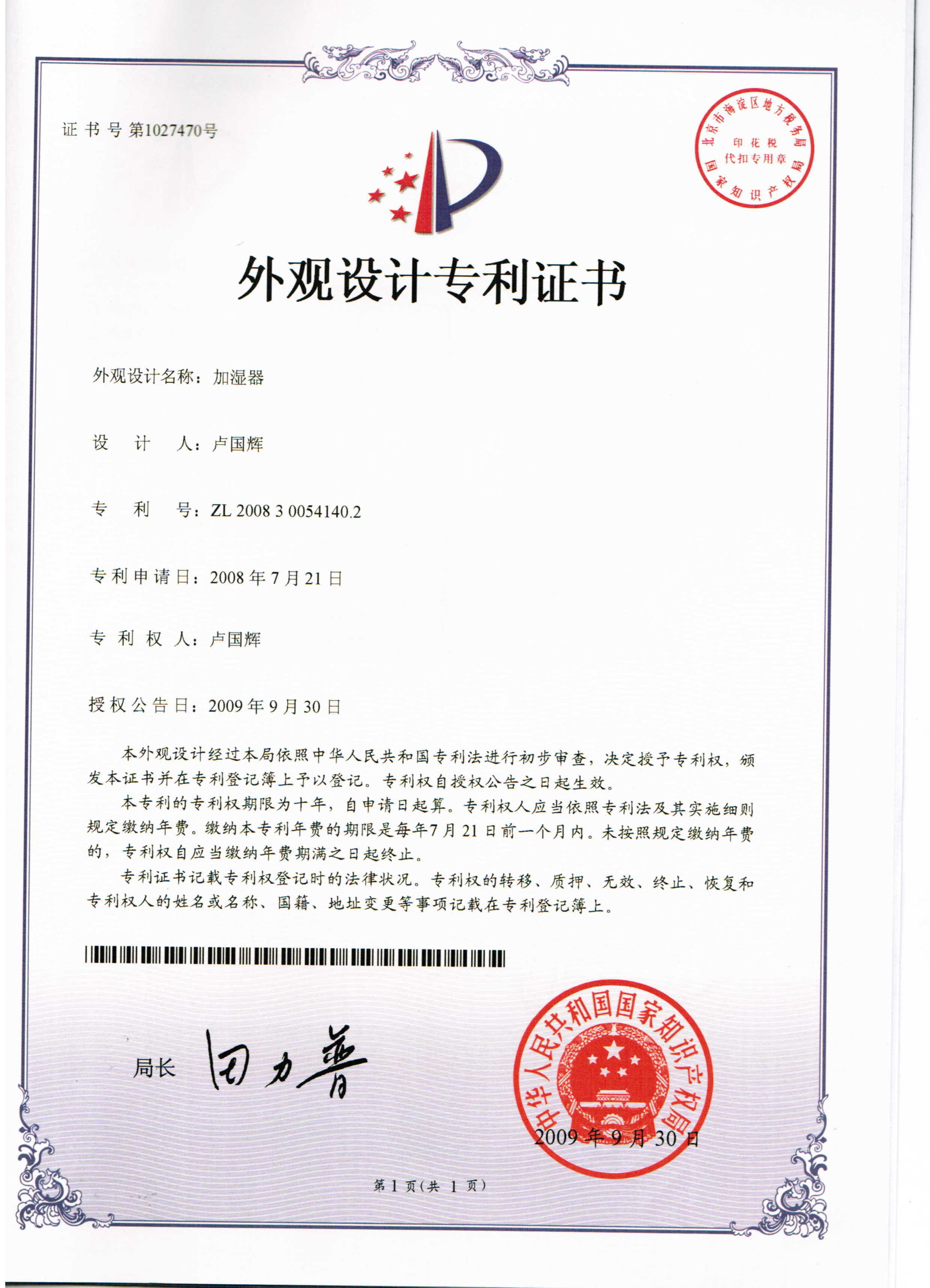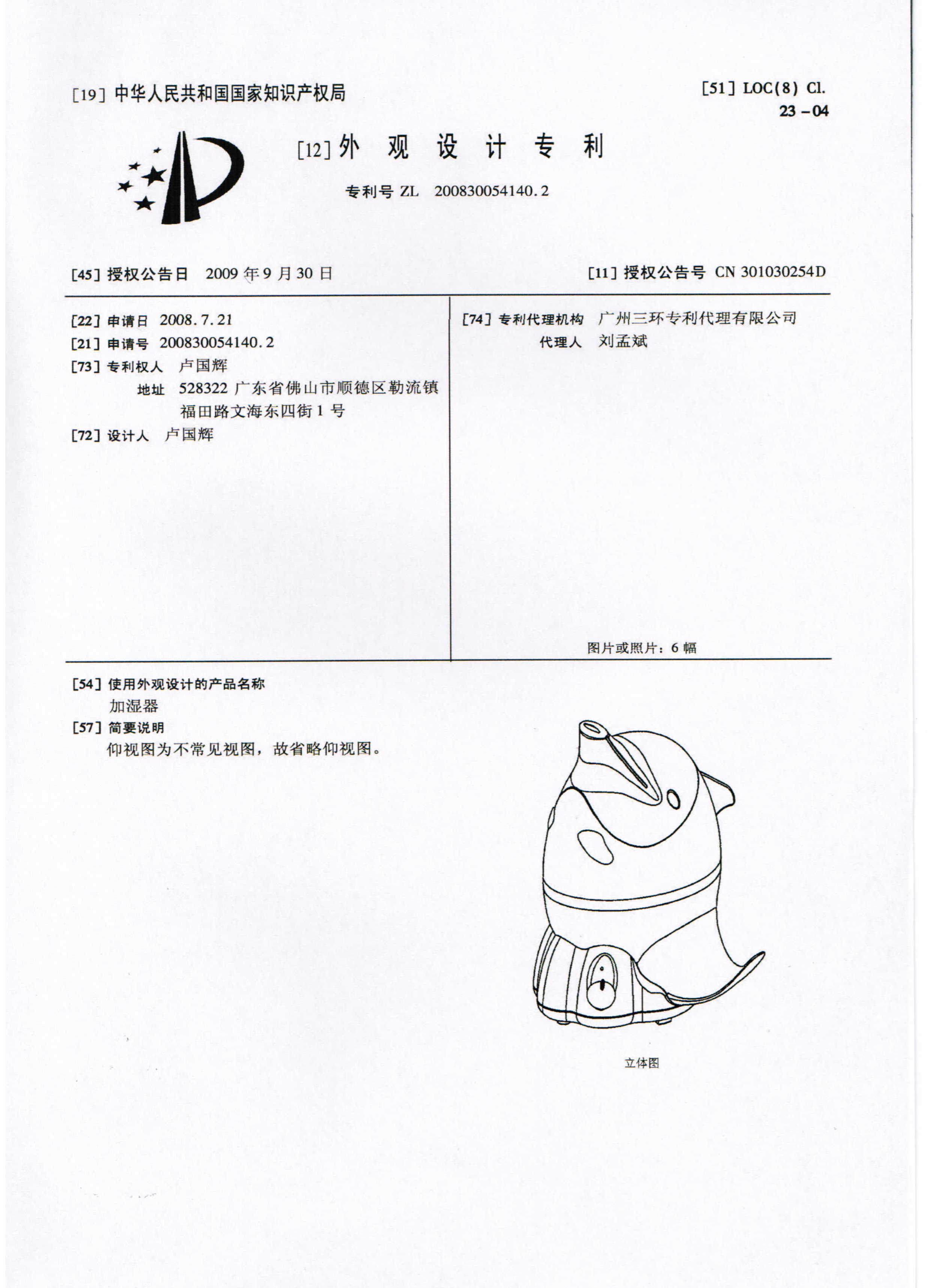 国辉证书:加湿器“团团圆圆”外观专利